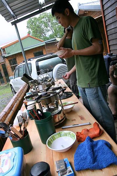 河馬大人也趕快搭營,因為氣候不穩,所以我跟摟信說,請他把民宿前的走道借給我們,我們今天的炊事區就在走道上了。