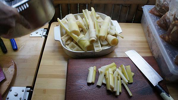 切好的桂竹筍加入河馬嫂準備的鵝油,酒,醬油,鹽,適量的冰糖一起下去悶煮就是一道最好吃的新鮮鵝油悶桂筍。
