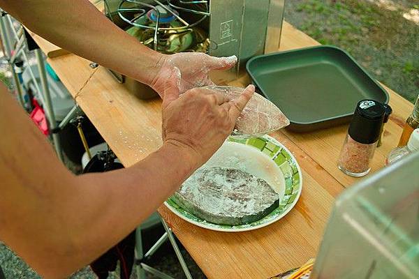 紅燒土魠魚今天由蓮花指小鍋主廚示範料理,拍粉。
